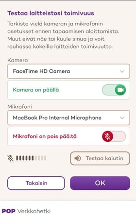 Kun avaat POP Verkkohetken ensimmäistä kertaa, ohjelma pyytää sinulta lupaa käyttää laitteesi kameraa ja mikrofonia. Vahvista käyttö napsauttamalla myöntävää vaihtoehtoa. Ponnahdusikkuna on usein ruudun oikeassa ylä- tai alareunassa.